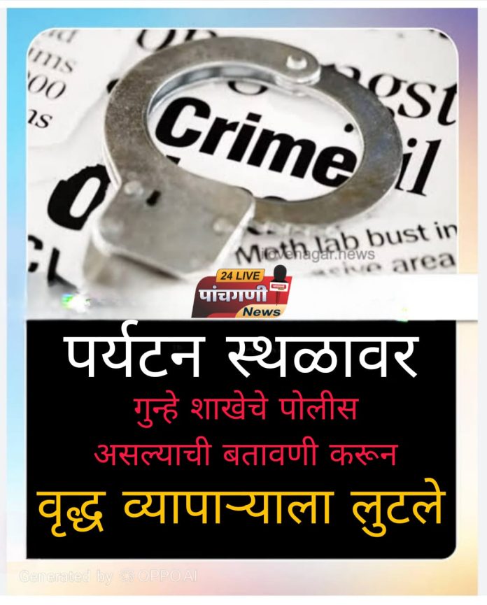 पाचगणी : आर्थिक गुन्हे शाखेचा अधिकारी असल्याचे भासवून एका 73 वर्षीय वृद्ध व्यापाऱ्याला गंडा घालत त्यांच्या अंगावरील सोने लुटल्याची धक्कादायक घटना आज सकाळी पाचगणी मुख्य बाजारपेठेत घडली. या घटनेमुळे संपूर्ण शहरात खळबळ उडाली असून, अज्ञात आरोपीचा शोध पोलीस घेत आहेत.